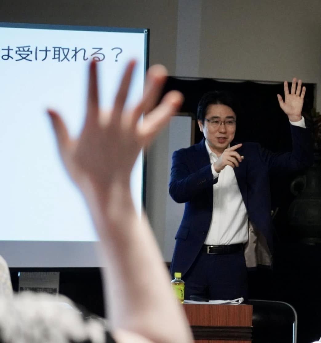 普段はつけない弁護士バッジ(バッジをつけない弁護士は多い)。でも、今日は各地域の法律講座だったので、特別に胸につけました。