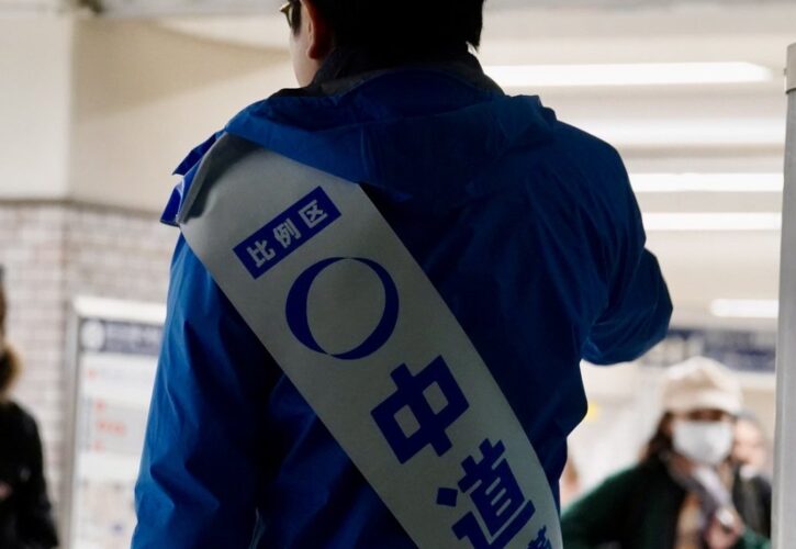 豊中駅で夜のご挨拶。タスキは中道。
