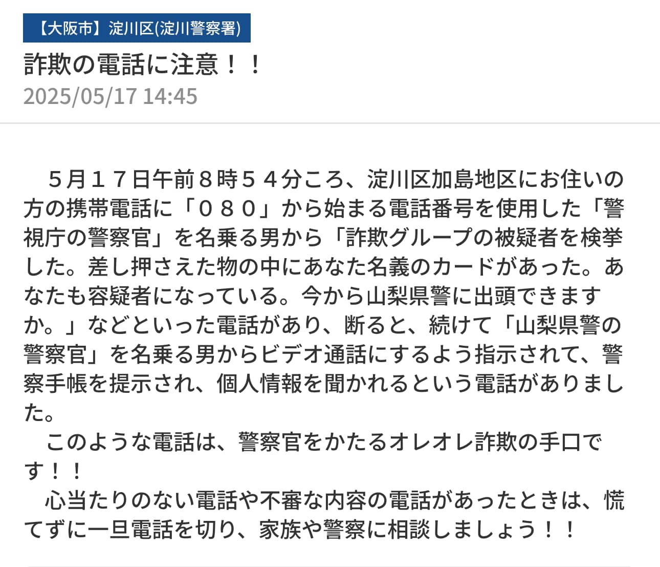 ニュース 法律講座 2025.05.19 ニュース Tweet 『知って得する!やさしい法律講座』を昨日、淀川区・加島地域で開催しました。 特殊詐欺の話も少ししたんですが、なんとその日の朝、まさに加島地域にお住まいの方の携帯に、「ニセ警察詐欺」の電話が。 講座中に、府警の安まちアプリからその通知が届いて、会場の空気が一瞬ざわつきました。 Tweet 地域行事に参加前の記事 朝の駅頭あいさつ次の記事